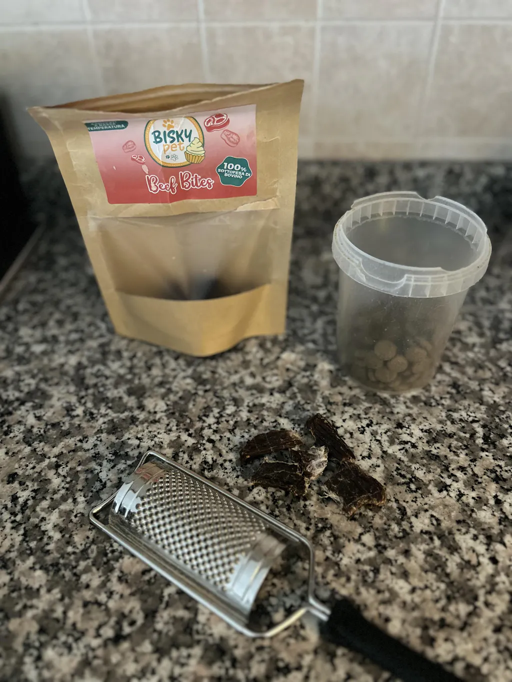 I nostri Beef Bites sono snack naturali per cani realizzati esclusivamente con sottofesa di manzo essiccata a bassa temperatura, in piccoli pezzetti o striscioline perfette come premio o spuntino.